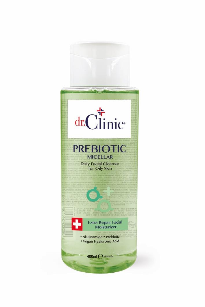 Prebiotic Micellar nga Dr.Clinic është pastruesi i përditshëm ideal për lëkurë me yndyrë. Me përbërës aktivë si niacinamidi, acid hialuronik vegan dhe formula prebiotike, ai pastron thellë, kontrollon yndyrën dhe ndihmon në riparimin dhe hidratimin e lëkurës. Ky hidratues ekstra riparues përmirëson strukturën e lëkurës dhe i jep asaj një pamje të shëndetshme dhe të freskët çdo ditë.