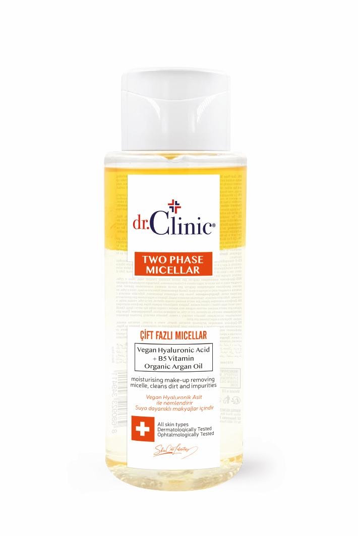 Largues i dyfazësh i grimave nga Dr.Clinic me acid hialuronik vegan, vitaminë B5 dhe vaj argani organik. Heq make-up-in, papastërtitë dhe yndyrën duke hidratuar lëkurën. I përshtatshëm për të gjitha llojet e lëkurës.
